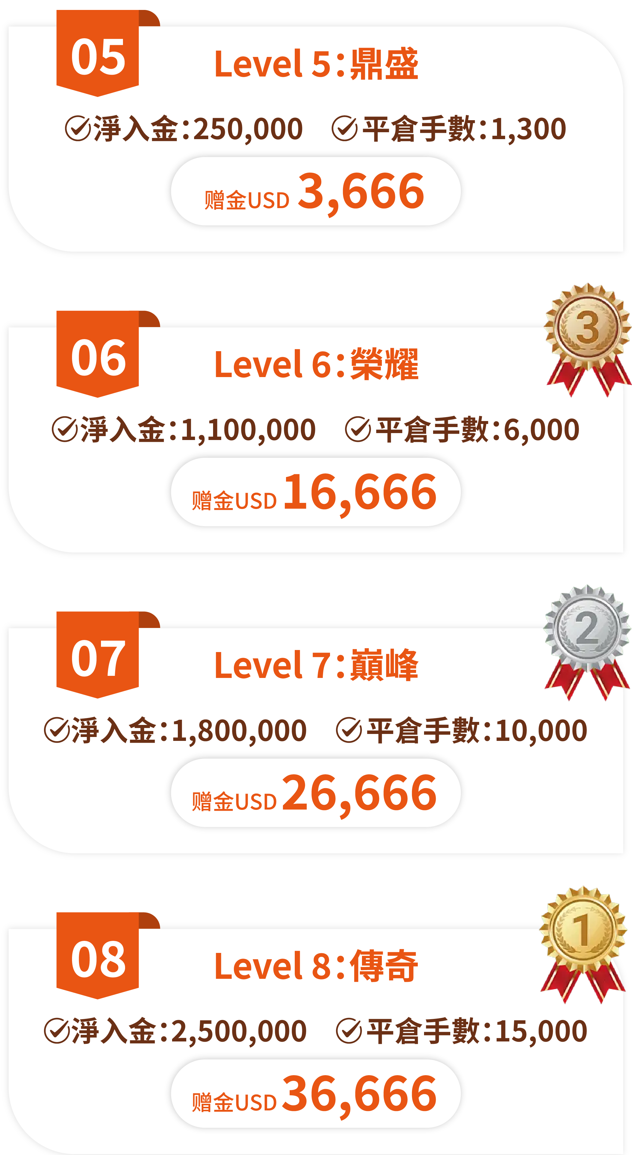 從啓航到傳奇,八大層級逐級解鎖!活動期間內,達成指定淨入金與平倉手數,即可解鎖對應層級贈金獎勵,最高可享 $36,666贈金回饋。